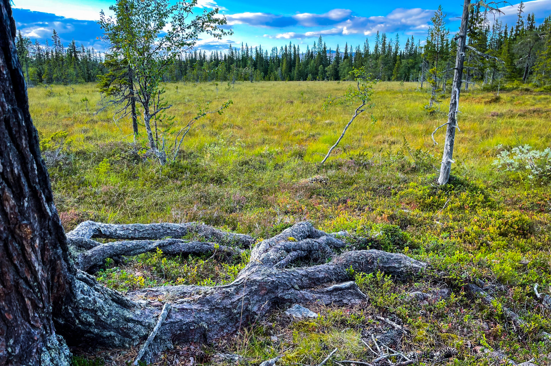 En gammal tall sträcker ut sina rötter över myren. I bakgrunden syns Hundshögen.