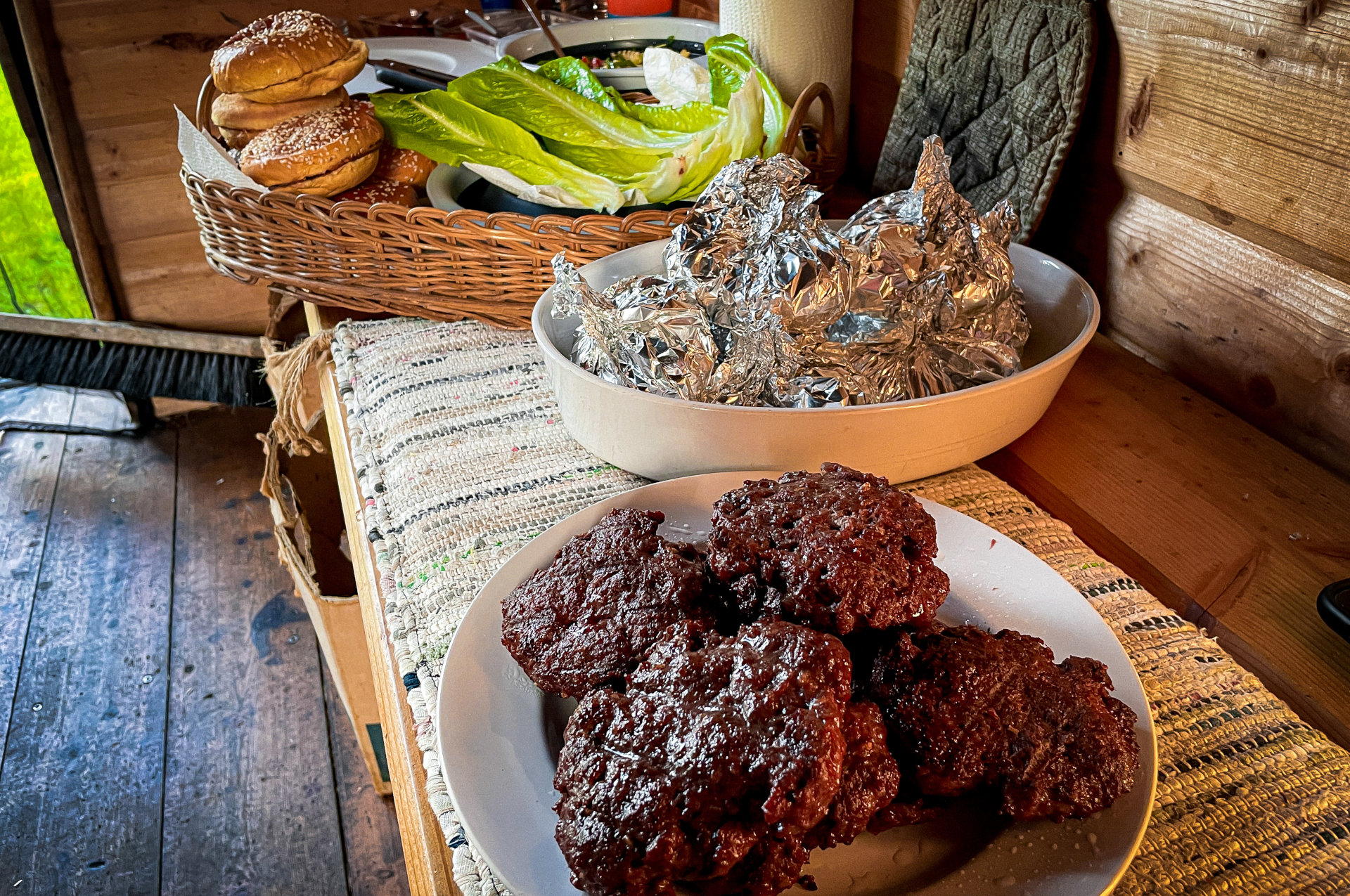 Tillaga dina renburgare över öppen eld i grillkåtan