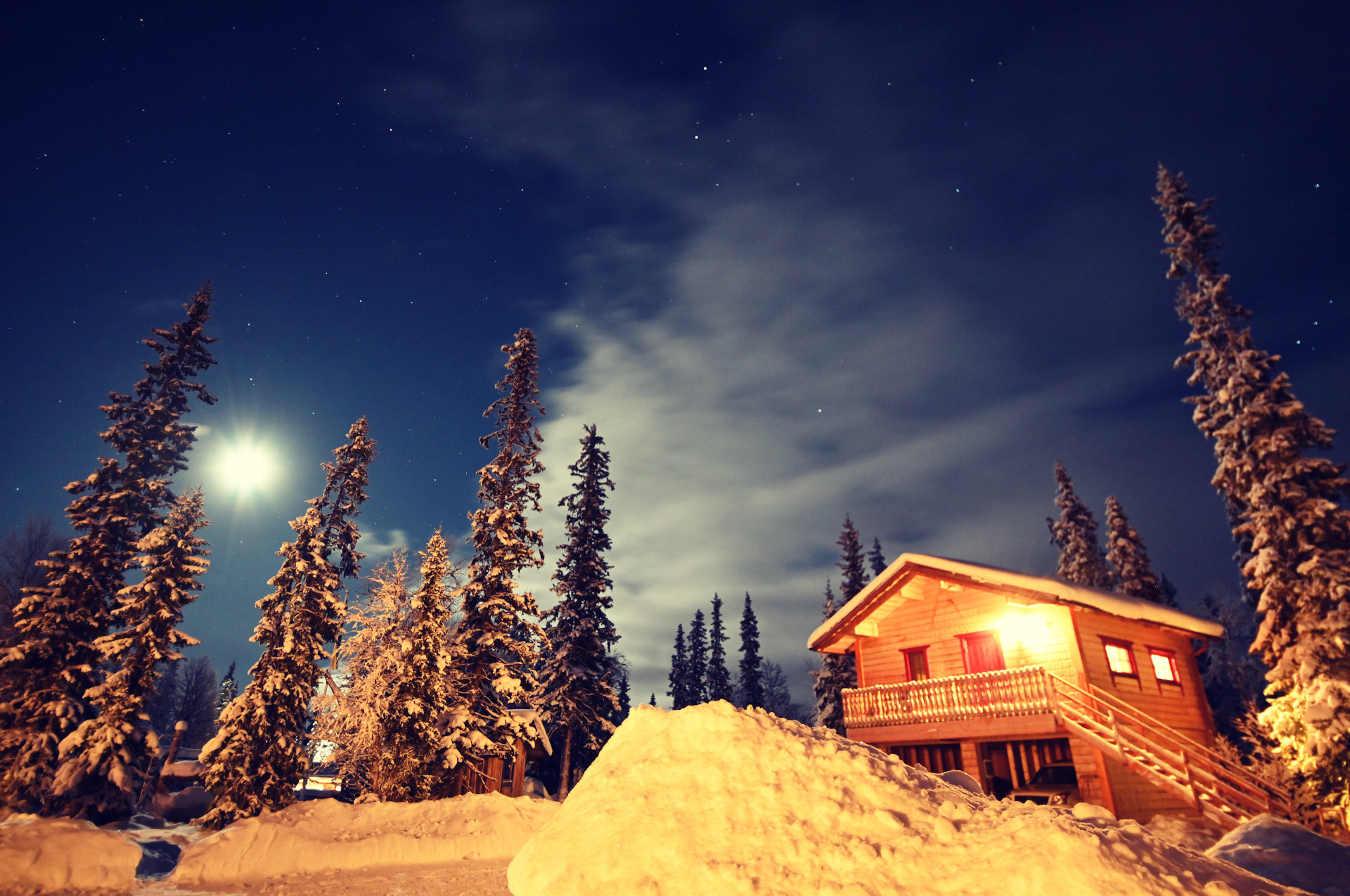 Vollmond und sternenklare Nacht in Jämtland. Im Hintergrund unsere Ferienwohnung Härbre.